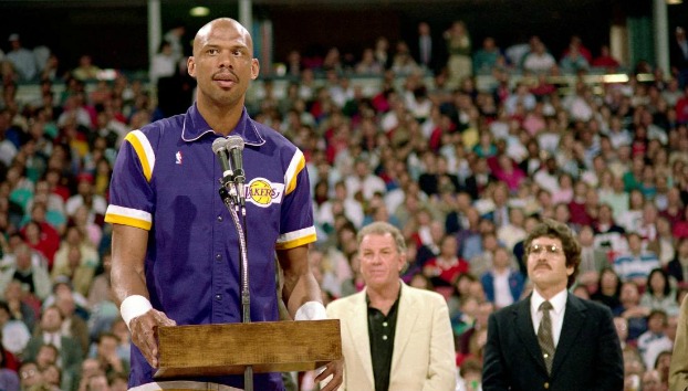 Τα όσα είχαν συμβεί όμως πριν από την έναρξη του αγώνα έχουν μείνει στην ιστορία. Ο Καρίμ Αμπντούλ-Τζαμπάρ παρουσιάζεται από τα μεγάφωνα του γηπέδου και στην αρένα επικρατεί πανικός, με ολόκληρη την οικογένεια του «Power of Tower» να βρίσκεται στον αγωνιστικό χώρο και τον 8χρονο γιο του, Αμίρ, να τραγουδά τον εθνικό ύμνο των ΗΠΑ, την ώρα που ο πατέρας του έπαιρνε τη θέση του στον «βασιλικό» θρόνο που έχει στηθεί προς τιμήν του, συγκρατώντας μετά βίας τα δάκρυα του.